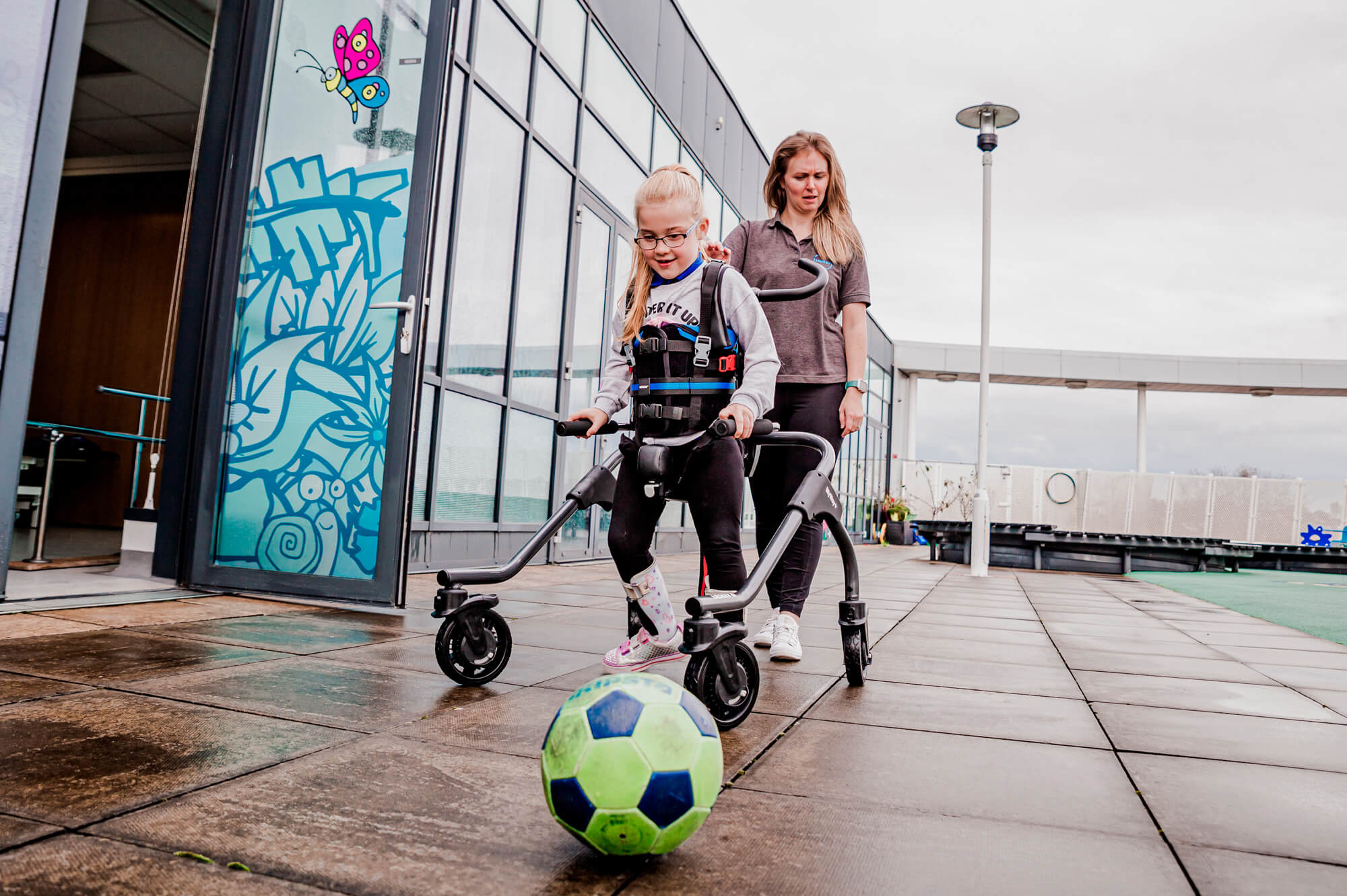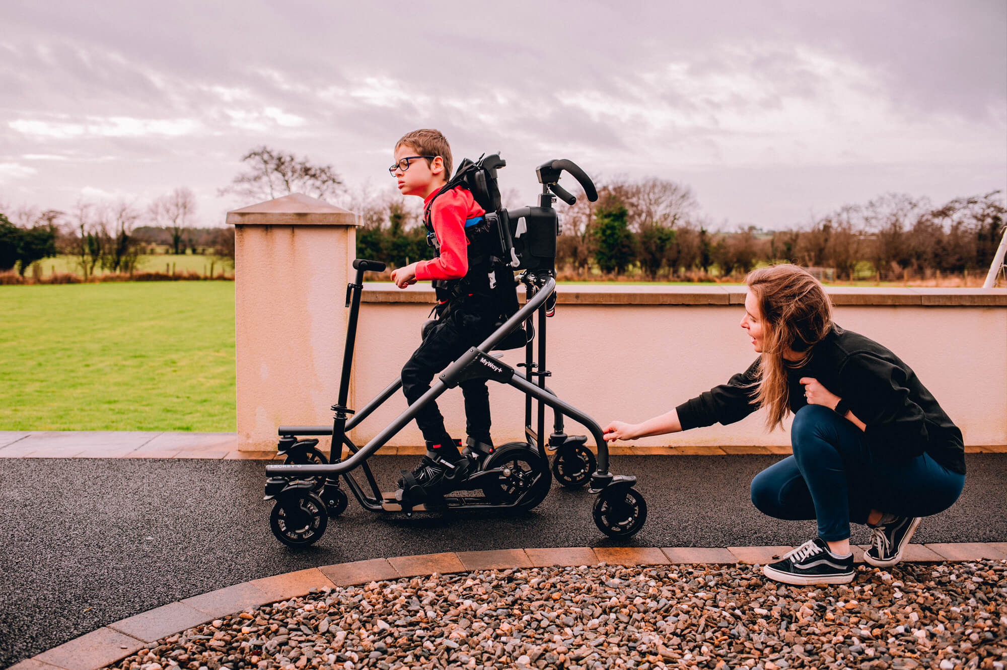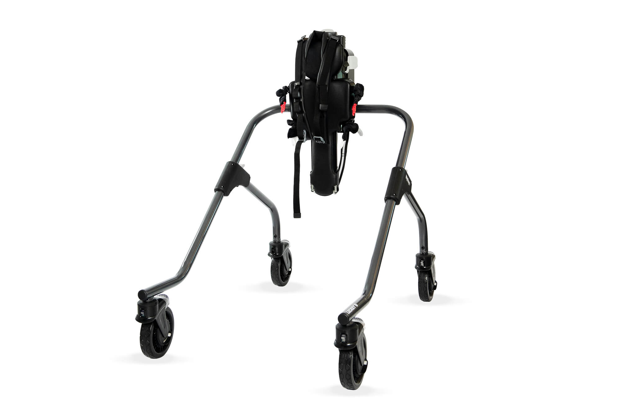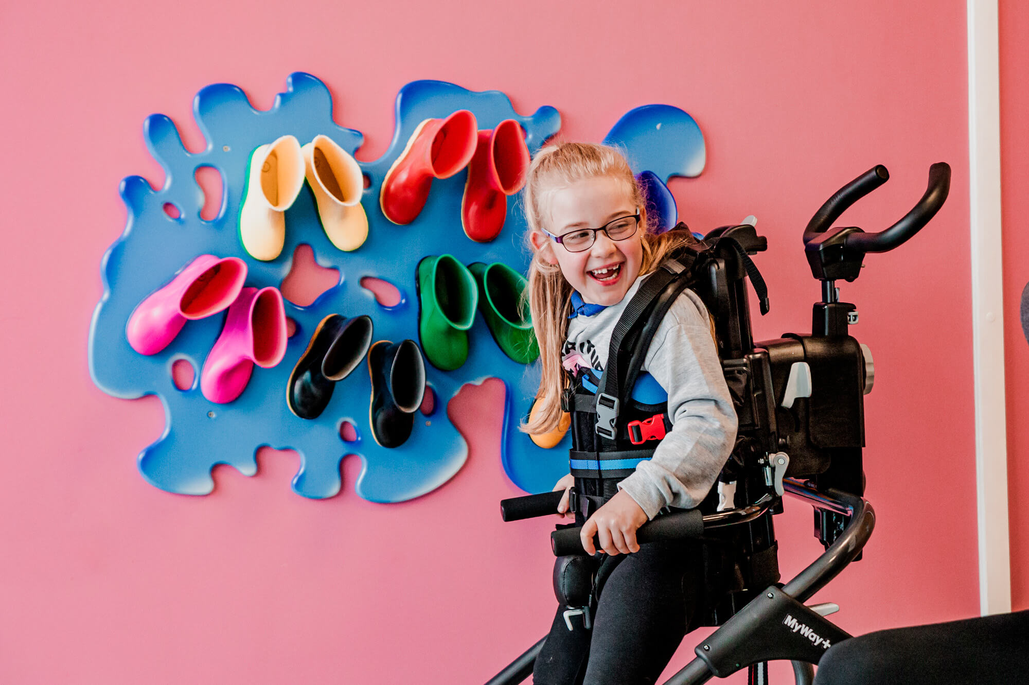 The elliptical movement provides a sensori-motor experience similar to gait and can be used passively at first by children who struggle to initiate any steps, to promote muscle memory patterns and encourage a good stepping motion; and later actively, by initiating the movement themselves. Children can also progress from having the ankle straps in place to then removing them for the hardest workout.
